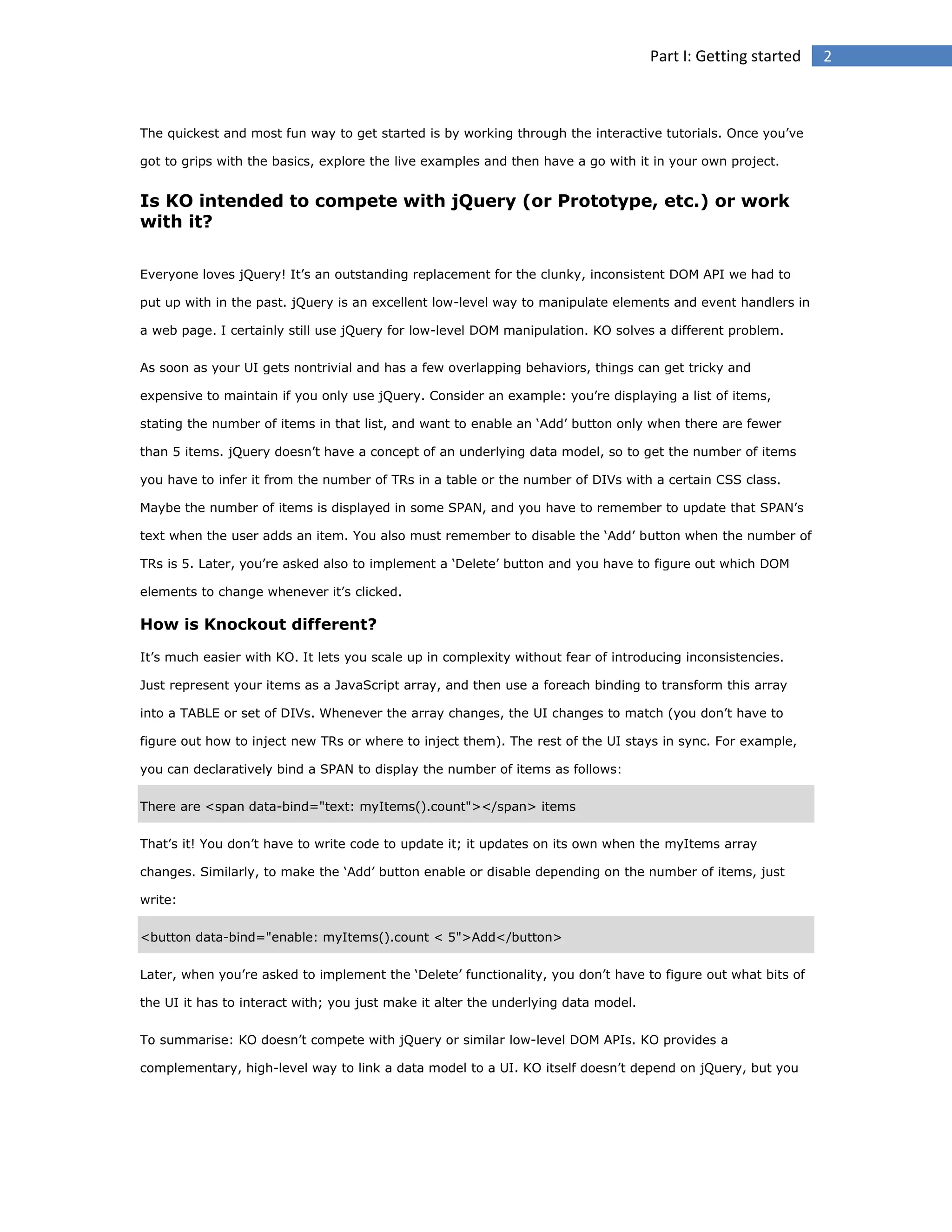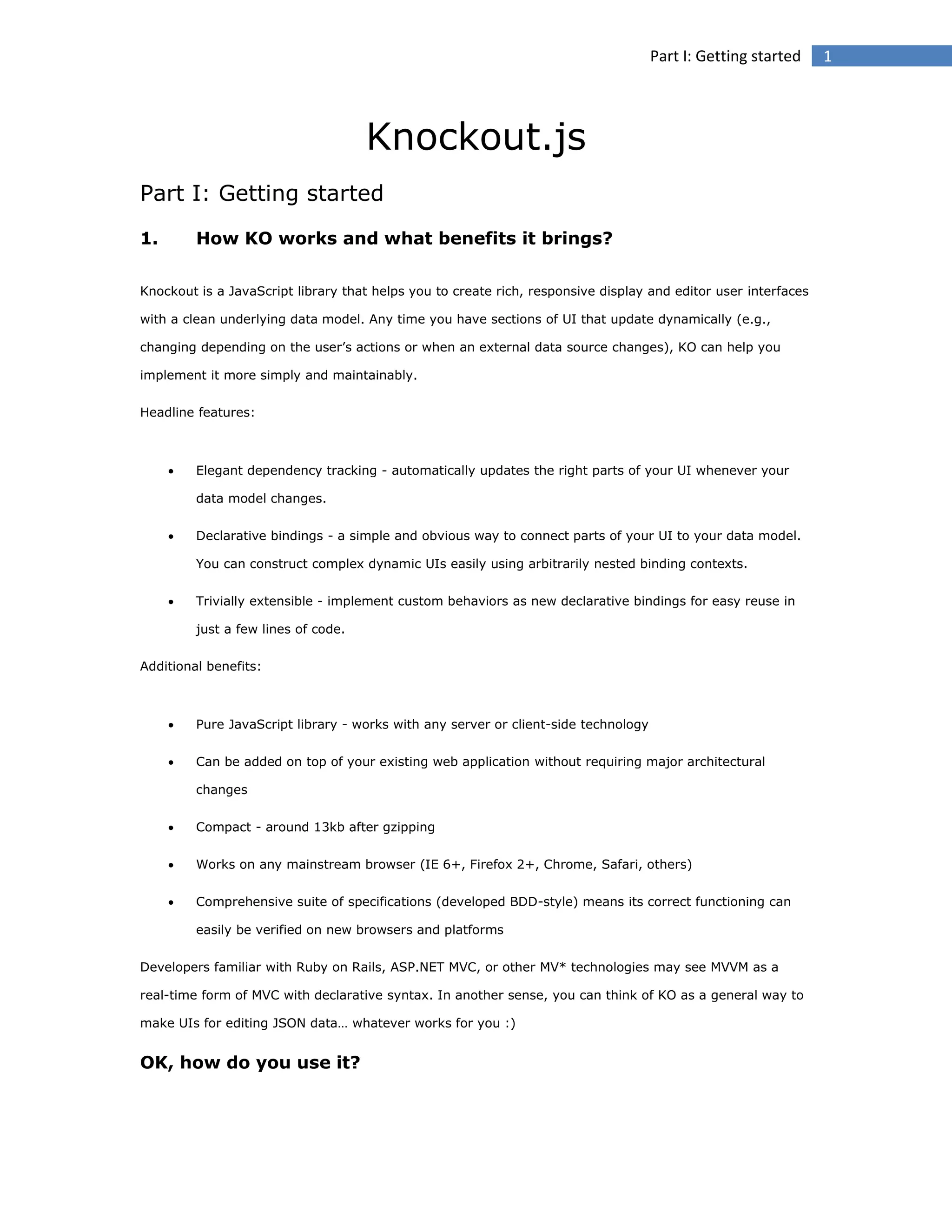 Knockout.js is a JavaScript library that helps create rich, responsive user interfaces by linking a data model to a UI. It provides elegant dependency tracking to automatically update the UI when the data changes. Key benefits include declarative bindings for easily connecting UI elements to the data model, and extensibility through custom bindings. The document introduces view models as a representation of the data and operations on the UI, separate from the persisted data model and UI presentation. It explains how to create a basic view model, activate Knockout to enable bindings, and use observables to make properties trigger updates when they change.