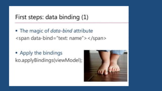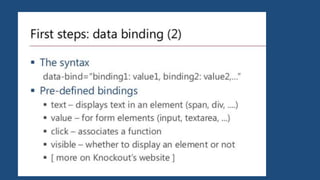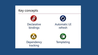 This document provides an overview of key concepts in Knockout including observables, computed values, observable arrays, built-in bindings, templates, and custom binding handlers. It explains how Knockout separates structure and behavior through declarative bindings and observables, and how it allows pushing data from source to target objects through observables.