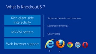 The document introduces Knockout.js, a JavaScript library for building dynamic user interfaces using the MVVM pattern, which facilitates rich client-side interactivity. It covers key concepts like observables, computed observables, and various binding types, as well as custom bindings for enhanced functionality. The document aims to provide a comprehensive understanding of Knockout.js features and its application in web development.