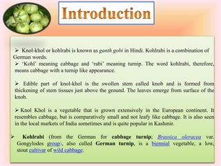 Knol-khol, also known as kohlrabi, is a cultivar of wild cabbage grown for its swollen stem. It is commonly consumed as a cooked vegetable in parts of Europe, Asia, and India. Breeding objectives for knol-khol include developing varieties with soft, mature bulbs at the edible stage; high yield; spherical swollen stems; and resistance to diseases. Breeding methods used include mass selection, line breeding, hybrid breeding to exploit heterosis, and introduction of germplasm from other regions.