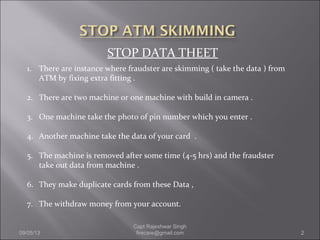 The document outlines security precautions for ATM operations, focusing on preventing skimming and fraudulent activities. Key measures include checking for unauthorized equipment, monitoring client behavior, and regular inspections of ATMs. Training for staff and guards is emphasized to enhance awareness and response to potential skimming devices.