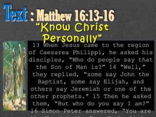 This document contains the sermon notes from Rev. Juanito D. Samillano Jr. from January 8, 2017. The sermon focuses on Jesus asking his disciples "But who do you say I am?" and Peter's response that Jesus is "the Christ, the Son of the living God." The sermon discusses how Jesus wanted a personal confession from his disciples rather than just acknowledging the miracles. It also emphasizes that knowing Christ personally is the foundation for all things and encourages attendees to consider how they would answer if Jesus asked them this question.