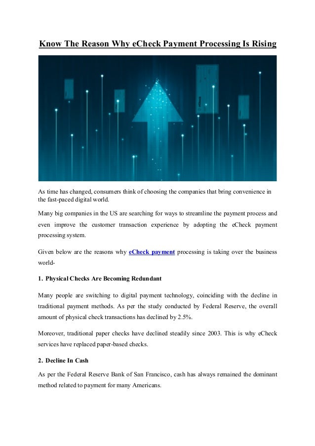The document outlines the rise of echeck payment processing due to its convenience and integration with digital payment systems, as traditional payment methods such as cash and physical checks decline. Key advantages include better technology, security, and verifiable evidence, making echecks appealing for businesses and consumers alike. As adoption grows, integrating echecks into existing payment infrastructures is encouraged to enhance transaction efficiency.