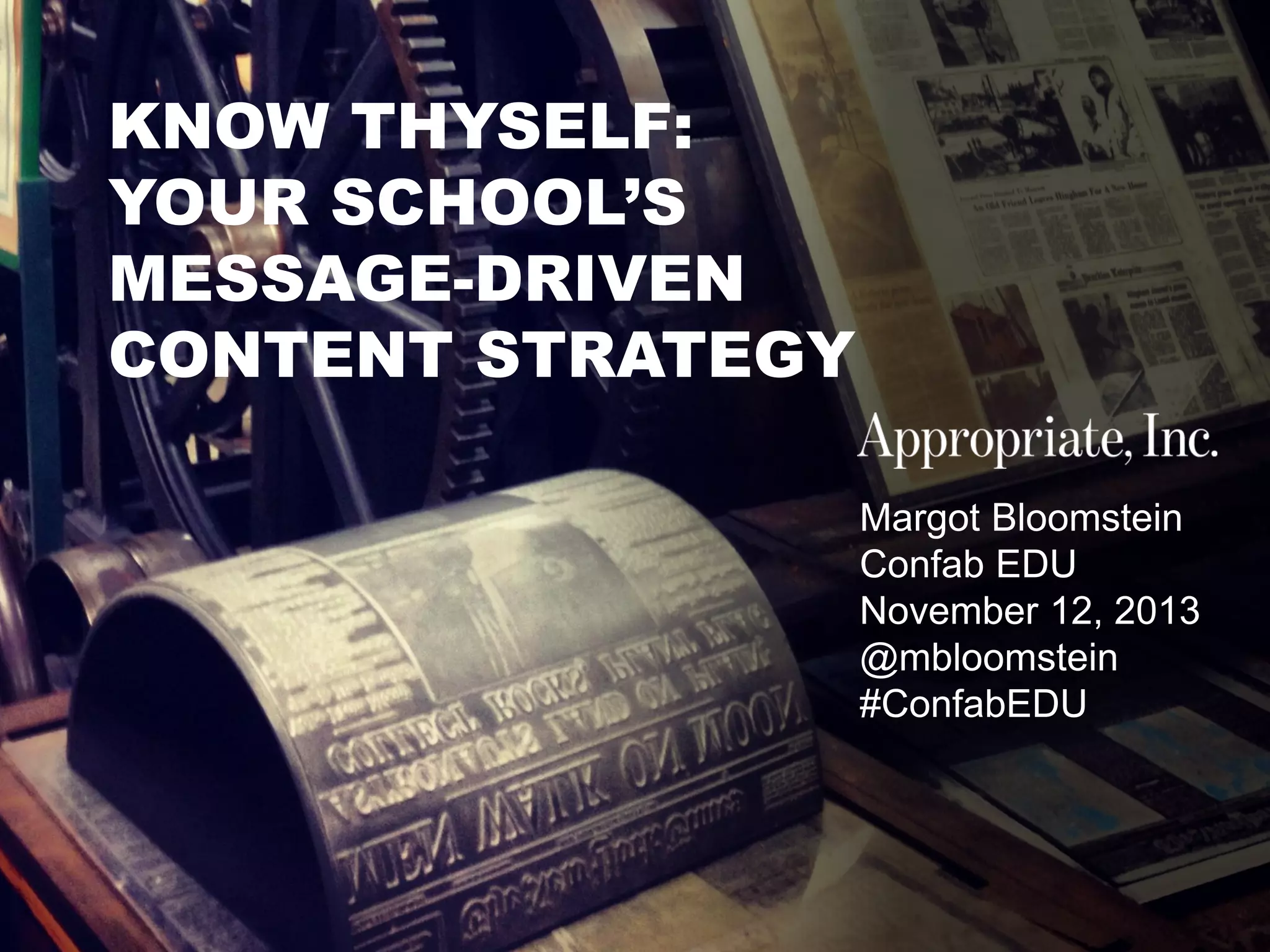 This document discusses the importance of developing a message-driven content strategy. It recommends that organizations first understand their core messages and goals through developing a message architecture. This will help ensure content supports the desired messaging. The document then discusses conducting a content audit to understand what content already exists and where gaps may be. Finally, it outlines subsequent steps in the content strategy process like creating a content matrix and style guidelines to align all communication. The overarching message is the importance of understanding an organization's core messaging before defining its content strategy.