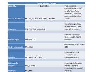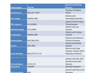 This document provides information on different medical specialties and their qualifications. It lists common medical specialties like general practitioner, physician, gynecologist, gastroenterologist, surgeon, orthopedic surgeon, urologist, nephrologist, pediatrician, neurologist, ENT surgeon, ophthalmologist, cardiologist, diabetologist, dentist, and chest physician. For each specialty it provides the common medical qualifications and describes the typical patients and ailments treated. It also includes an expansion of common medical degree abbreviations.