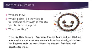 The document outlines the importance of understanding customers through user personas and customer journey maps, emphasizing their roles in product management and marketing. It provides insights into how to create user personas based on research encompassing demographics and psychographics, as well as how to map customer journeys to identify pain points and improve user experience. Additionally, it discusses the Kano model for prioritizing features based on customer satisfaction and the diffusion of innovations to understand how new products are adopted in the market.