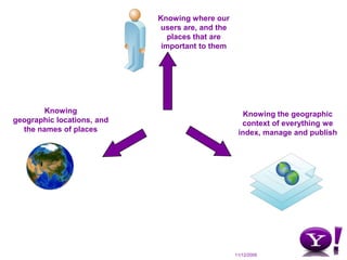 The document discusses the evolution of the internet from web 1.0 to web 2.0, emphasizing the importance of location-based services and geo-enriched content. It highlights the rapid growth of local search queries and the shift in advertising spending towards online platforms. Additionally, it stresses the need for a better understanding of geography and the development of technologies to enhance location awareness in online applications.
