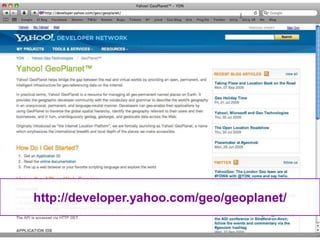 This document discusses the increasing importance of location data on the internet. As the web evolves from a network of documents to a network of people, location and geographic context are becoming central to how people use and interact with information online. The document outlines how local search queries are growing rapidly, and how location-based advertising and apps are driving this trend. It also introduces several Yahoo! technologies and data sources that can help websites better understand location, including GeoPlanet for place data and WOEIDs, and APIs for geocoding, place-finding, and more. Location data is transforming the internet as everything from search to social becomes more place-based.