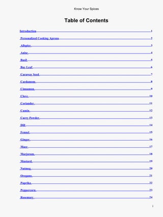 The document provides information about various spices. It includes sections on allspice, anise, basil, bay leaf and caraway seed that describe the plants the spices come from, their flavors, and common uses in cooking. The document appears to be an excerpt from a book that provides profiles of different spices to help readers learn about their properties and how to use them.