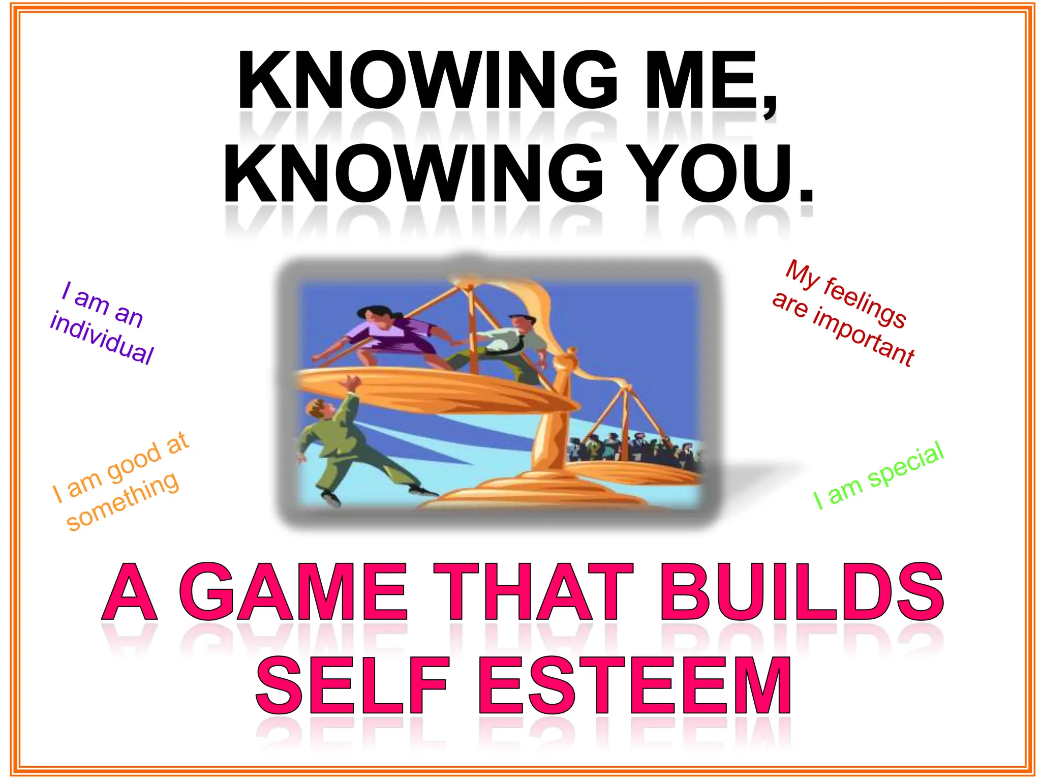 Knowing me, Knowingyou.My feelings are importantI am an individualI am good at somethingI am specialA game that buildsSelf esteem