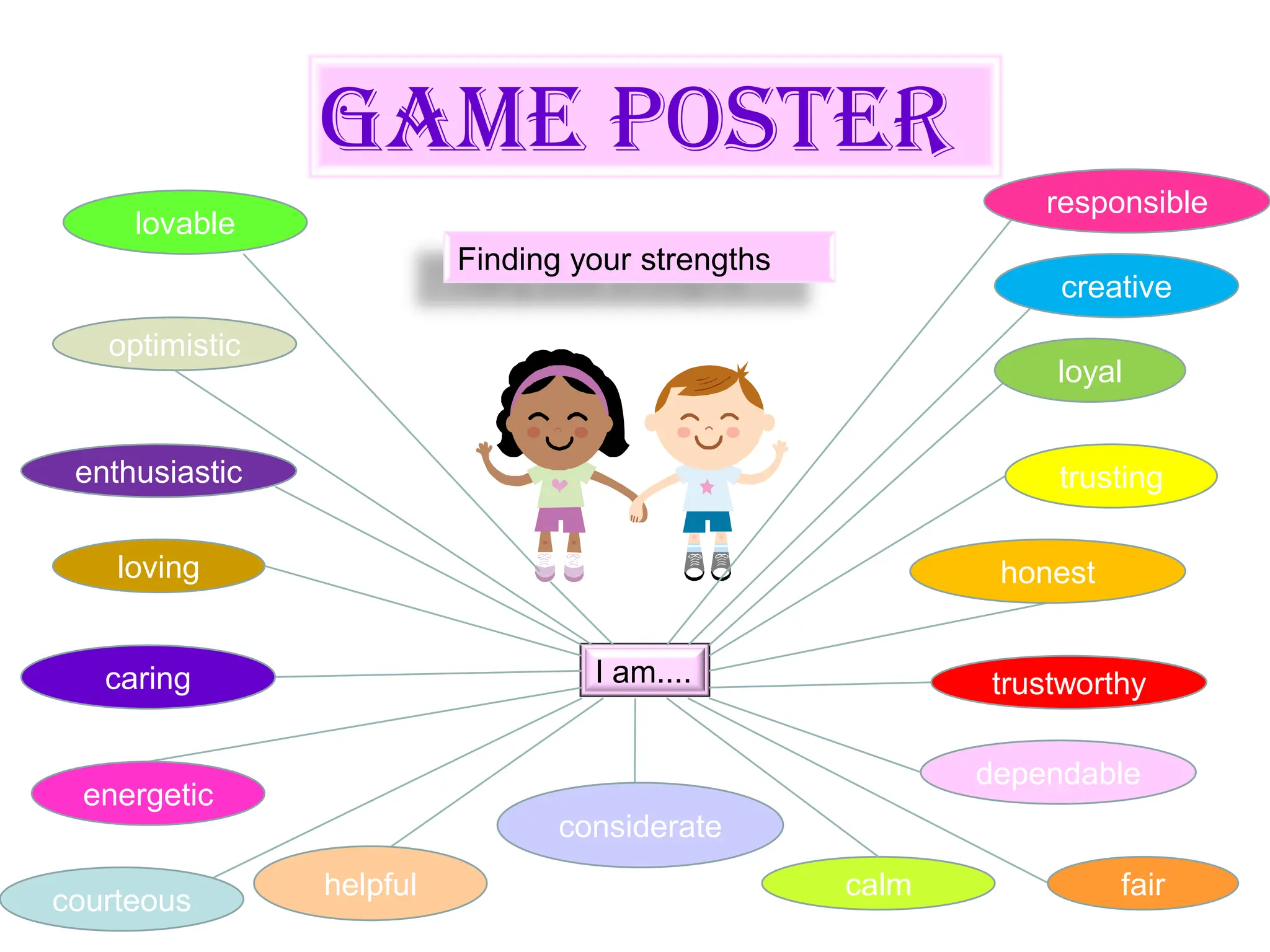 GAME POSTERresponsiblelovableFinding yourstrengthscreativeoptimisticloyaltrustingenthusiastichonestlovingI am....caringtrustworthydependableenergeticconsideratehelpfulcalmfaircourteous