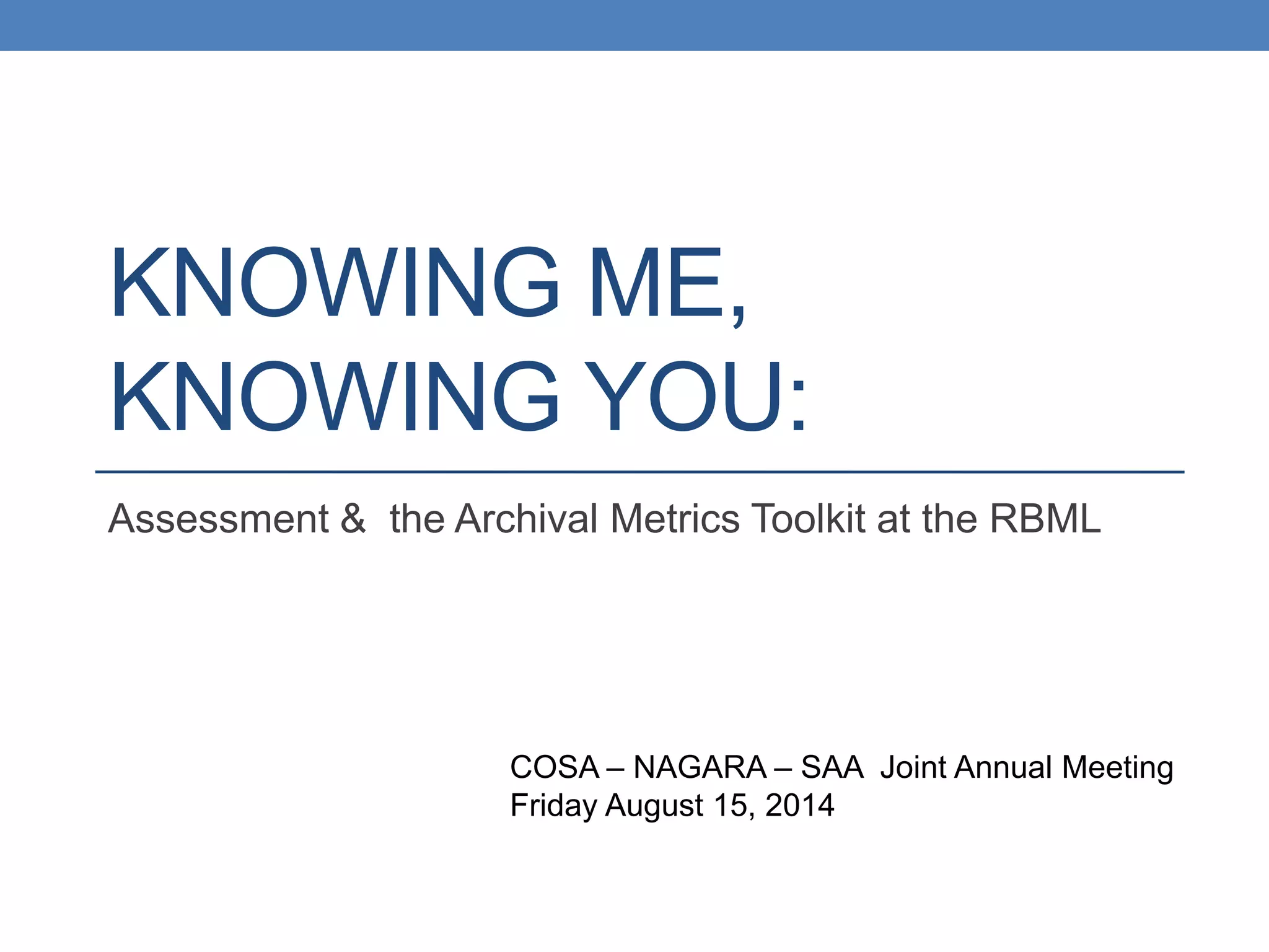 The document outlines the goals and findings of an assessment initiative at the Rare Book and Manuscript Library (RBML) aimed at understanding user needs and improving services. It presents survey data from various user categories, revealing satisfaction levels and usage patterns. Key insights include the importance of planning, staff engagement, and adaptability in the assessment process.