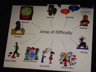 This document discusses various learning disabilities in children, including dyslexia, dyscalculia, dysgraphia, and developmental dyspraxia, emphasizing their non-relations to sensory impairments or IQ levels. It debunks common myths about learning disabilities and highlights the need for proper intervention and awareness to support affected individuals in educational settings. It also outlines teaching strategies and services needed to enhance inclusive education for children with learning disabilities.