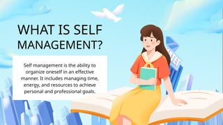 Self-management is the ability to effectively organize oneself to achieve personal and professional goals, encompassing awareness, time management, emotional regulation, and continuous development. Key components include self-awareness to recognize strengths and weaknesses, time management for productivity, and emotion management for maintaining focus. A model like the Johari window can enhance communication and self-awareness, essential for long-term success.