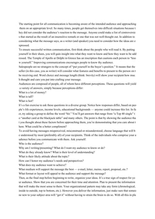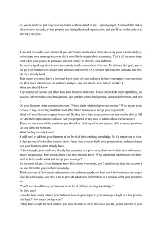 The document discusses the importance of understanding your audience when communicating. It emphasizes that people should consider the audience's perspective, background, interests and existing knowledge to ensure the message is understood properly. It provides tips for audience analysis, such as determining what the audience already knows and cares about, as well as acknowledging any attitudes or concerns they may have. The overall goal is to shape the message in a way that respects the audience and gains their acceptance.