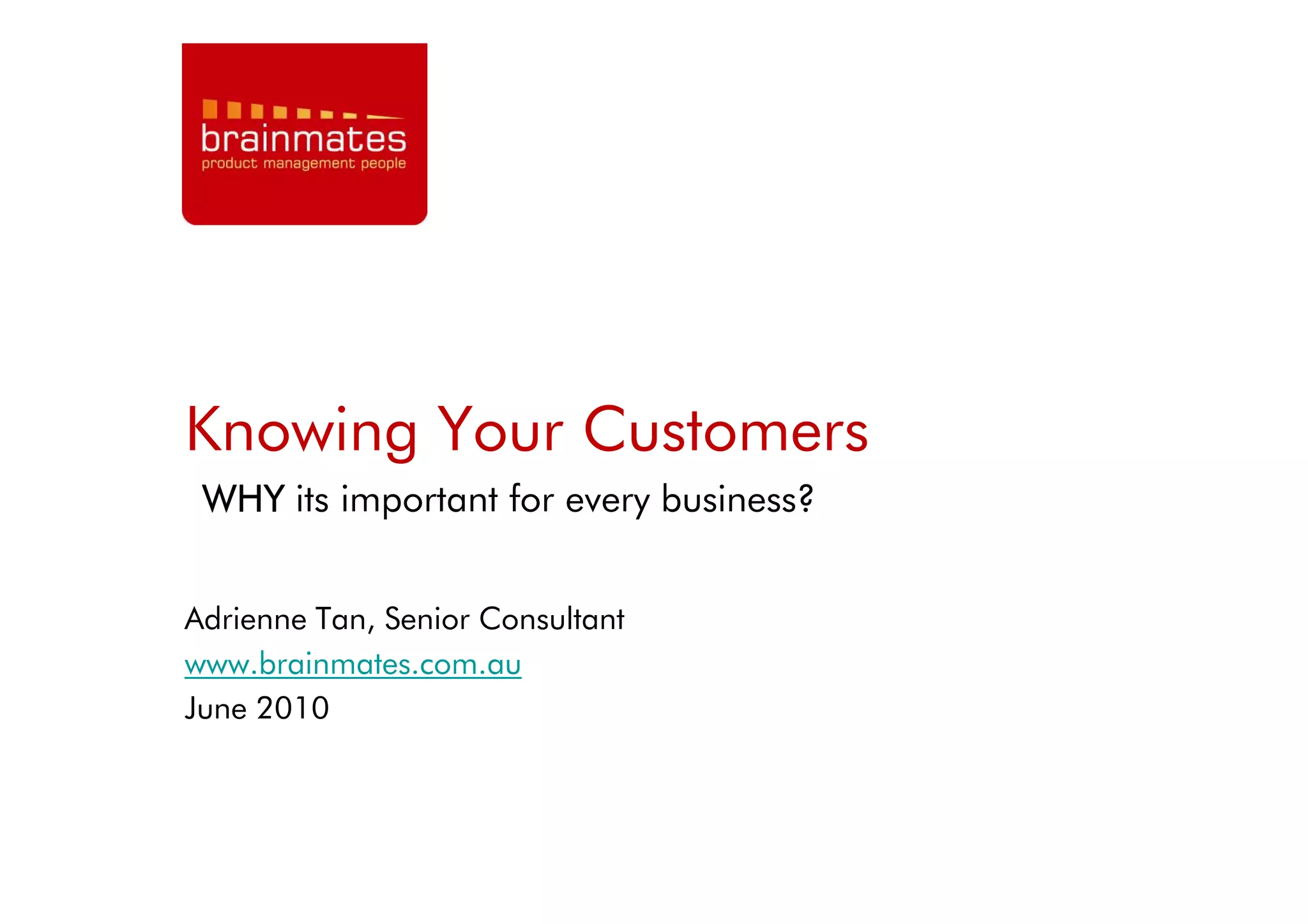 Knowing your customers is important for businesses to guide decisions, ensure the right products are created to satisfy customer needs, and speak in a language customers understand in order to find where customers are, differentiate from competition, and ultimately grow revenue. Understanding customers informs product innovation and design and helps companies define, develop and deploy customer-centric products and services.