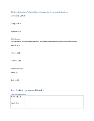 1) The document discusses the topic of idolatry and fighting idolatry in one's life. It provides biblical examples of how Israel struggled with idolatry and faced consequences.