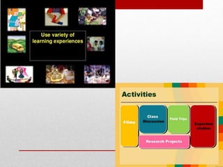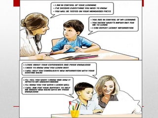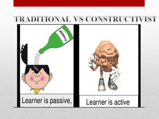 The document discusses constructivism, a learning theory where students actively construct knowledge through experiences. It states that constructivism focuses on how children learn through adaptation and by becoming active participants in the learning process. The role of teachers in constructivist learning is to create a collaborative problem-solving environment and act as facilitators rather than instructors. Elements of constructivist learning design include developing an initial situation for students, grouping students, building a bridge between prior and new knowledge, asking probing questions, having students exhibit their understandings, and facilitating student reflections.