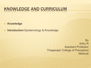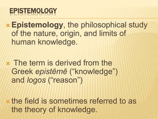 The document explores epistemology, which is the philosophical study of knowledge, focusing on its nature, origin, and limits. It discusses various theories and classifications of knowledge, including the perspectives of philosophers like Plato and John Locke, and elaborates on different types of knowledge such as experiential, intuitive, and embedded knowledge. Additionally, it covers how knowledge can be categorized based on fields of study like natural and social sciences, as well as the role of perception, reason, and context in knowledge acquisition.