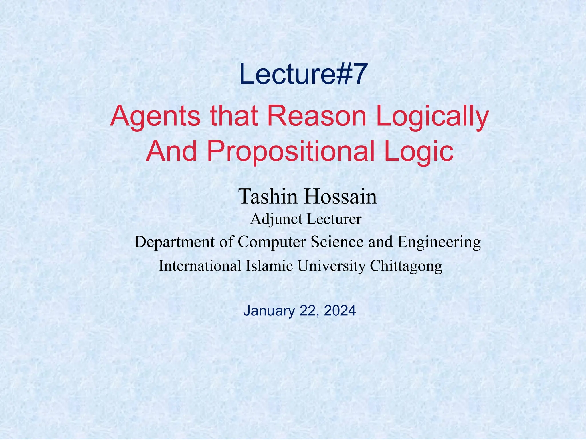The document is a lecture from International Islamic University Chittagong on logical reasoning and propositional logic in artificial intelligence. It covers topics such as knowledge representation, reasoning methods, kinds of logical agents, and detailed structure on propositional and first-order logic. Additionally, it discusses inference rules, satisfiability, resolution, and the applications of these concepts in AI systems.
