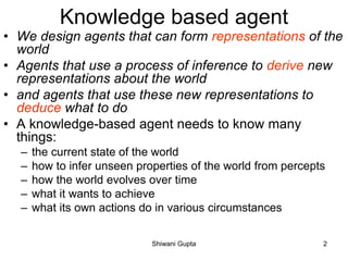 The document discusses knowledge-based agents and how they use inference to derive new representations of the world from their knowledge base in order to determine what actions to take. It provides the example of an agent exploring a cave, or "Wumpus world", where the goal is to locate gold and exit without being killed by the Wumpus monster or falling into pits. The agent uses its percepts and knowledge base along with inference rules to deduce its next action at each step.