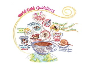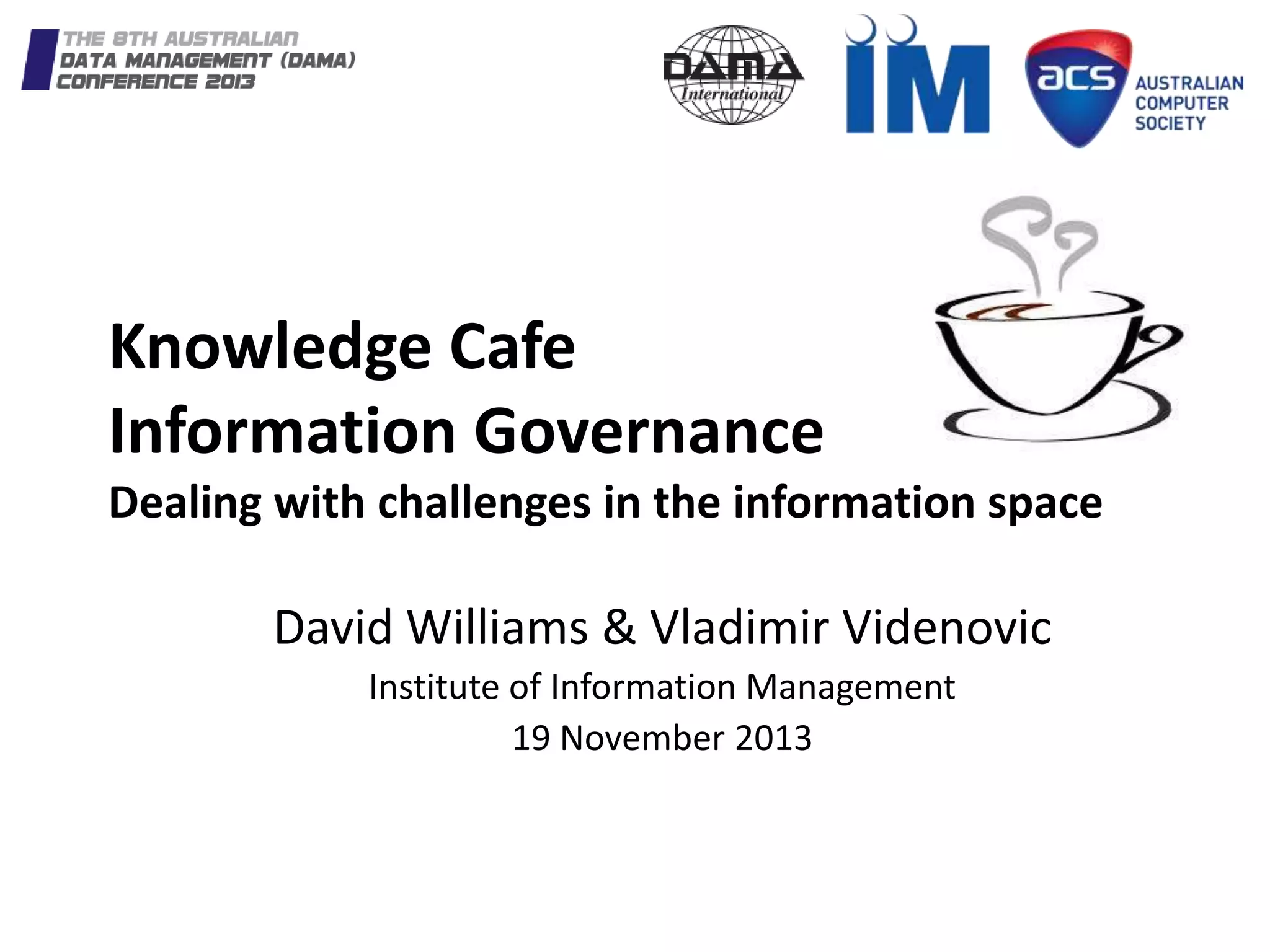 The document describes a Knowledge Cafe event aimed at exploring information governance issues through conversation. A Knowledge Cafe brings people together for an open discussion on a topic of mutual interest to share ideas and gain understanding. It describes the cafe process which involves forming small groups to discuss questions, then rotating groups to connect diverse conversations. Principles include encouraging participation, listening more than speaking, and focusing on learning rather than reaching consensus. The goal is to spark new insights and perspectives through an informal and collaborative discussion format.