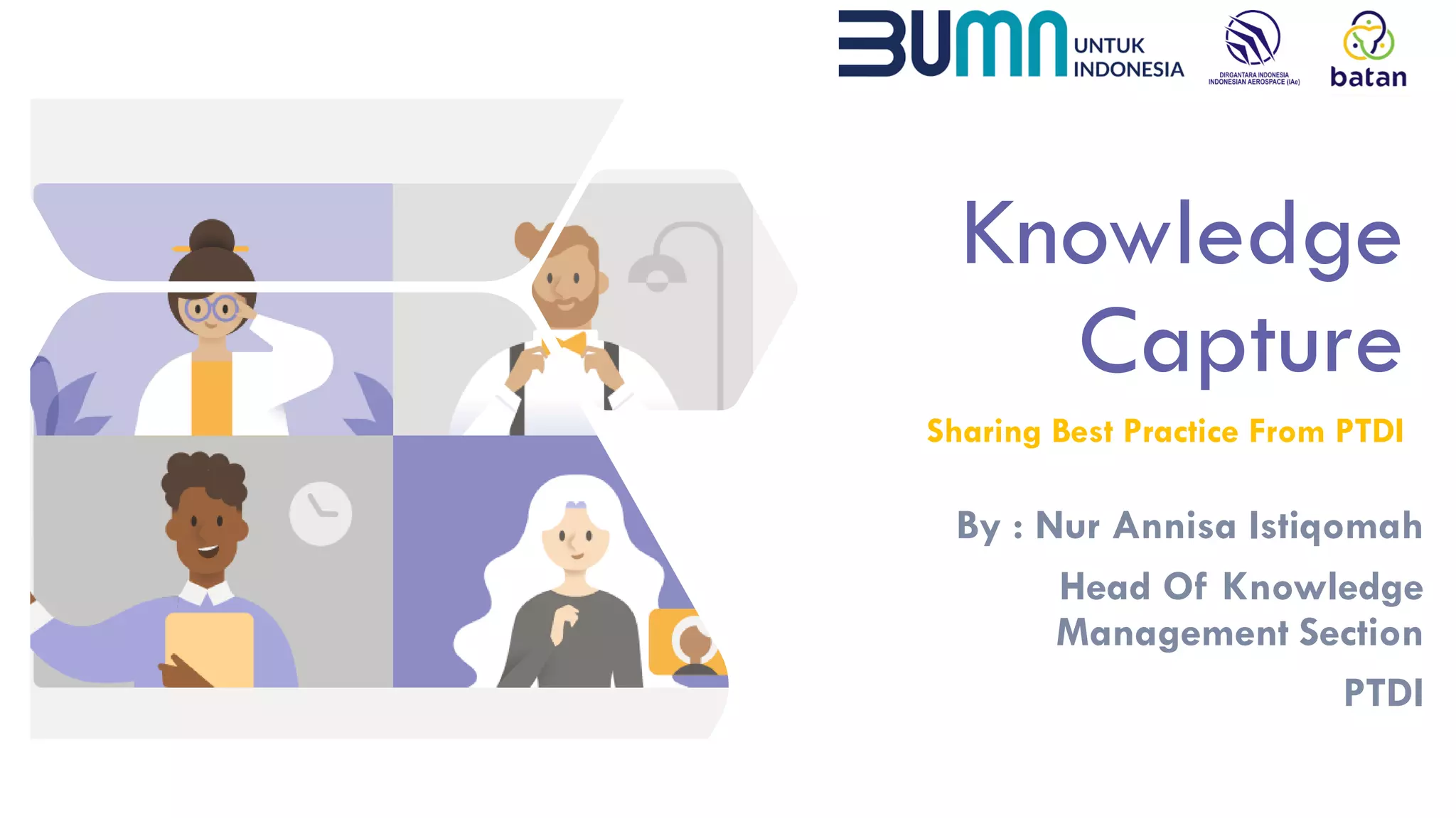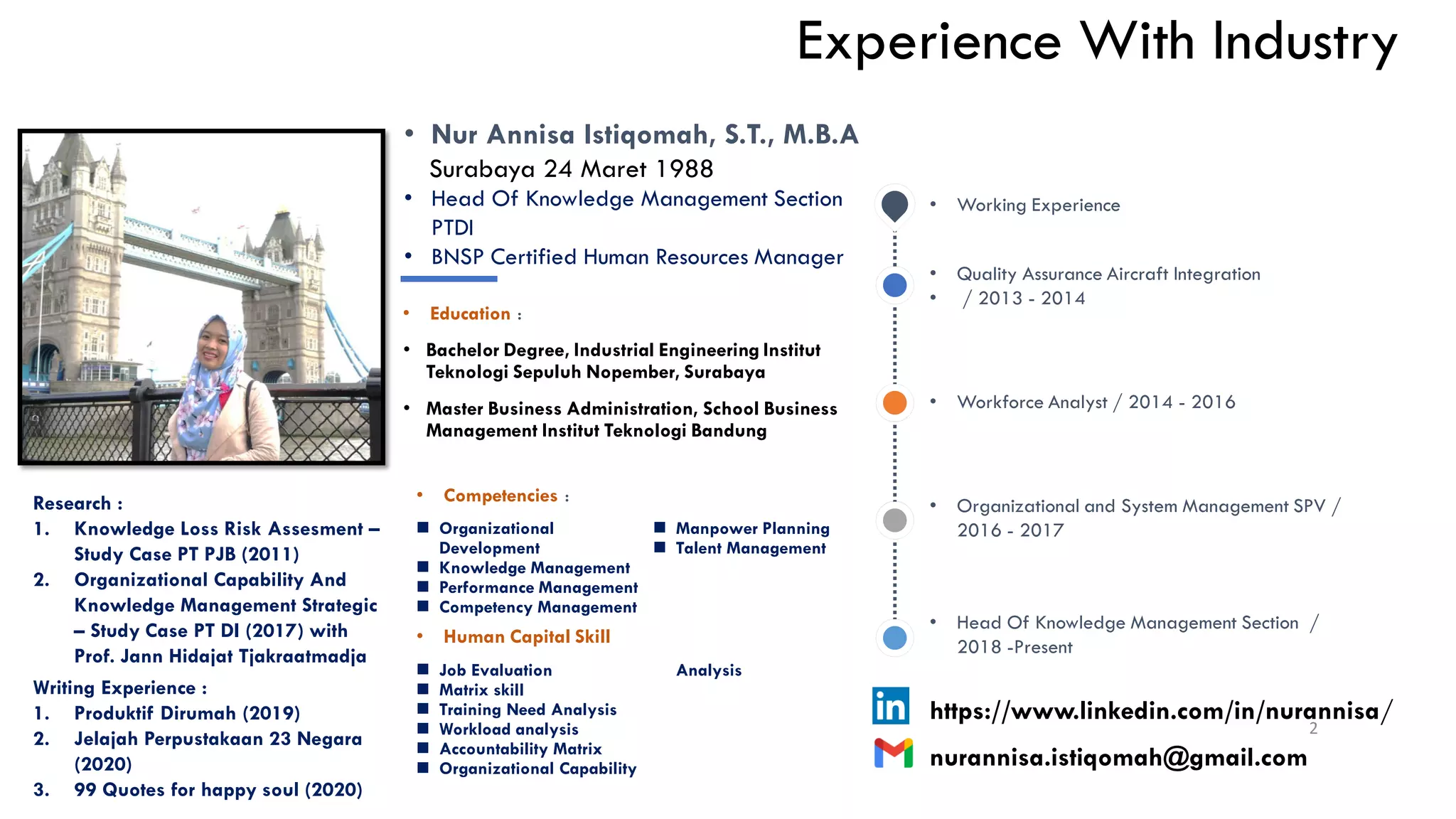 Dokumen tersebut merangkum biografi dan pengalaman kerja Nur Annisa Istiqomah sebagai Kepala Bagian Manajemen Pengetahuan di PTDI. Dokumen tersebut juga menjelaskan metode-metode khas yang digunakan PTDI dalam menangkap pengetahuan karyawan berpengalaman, seperti job shadowing."