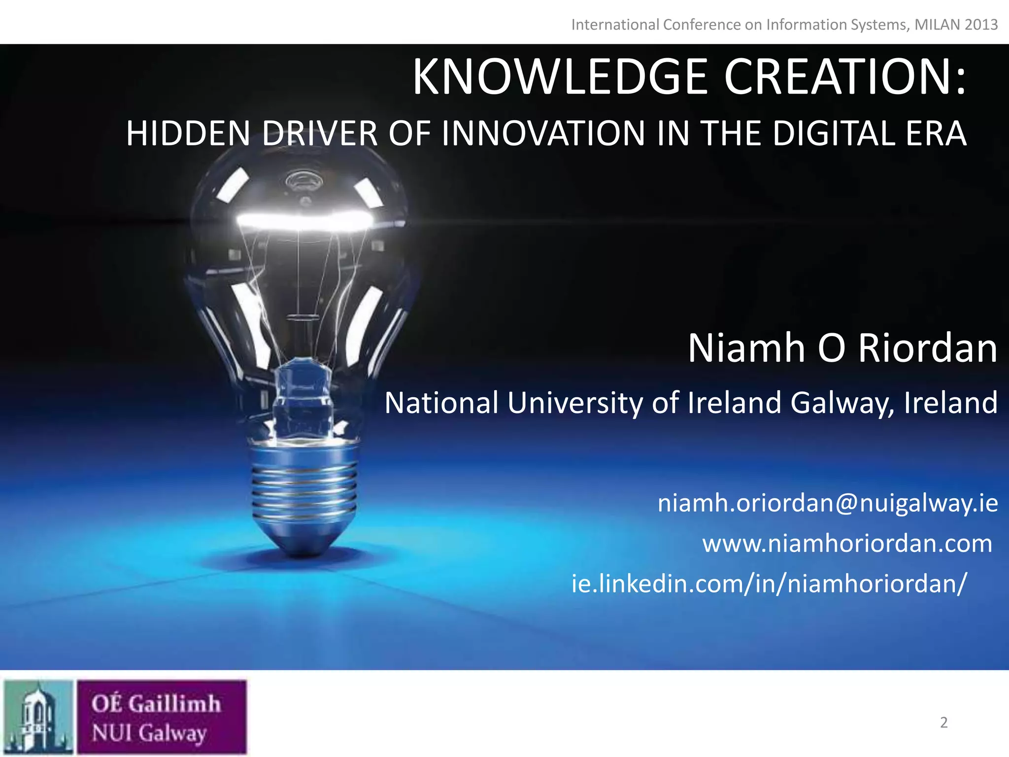 The document discusses the integral relationship between knowledge creation and organizational innovation, emphasizing the role of new knowledge in driving innovation processes. It presents a conceptual framework and research methodology based on case studies exploring digitally enacted innovation, concluding that innovation can be fostered by stimulating knowledge creation. The findings suggest viewing innovation through a knowledge-based lens, highlighting the importance of understanding both declarative and procedural knowledge forms.