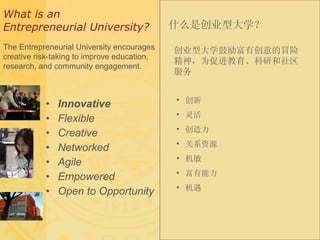 The document discusses knowledge entrepreneurship as an educational tool at Arizona State University. It describes how ASU encourages creative risk-taking through entrepreneurial initiatives across the university, including programs in technology, business, arts, journalism, health, non-profits, and education. These initiatives empower students and faculty to be entrepreneurial and transform knowledge into action through commercialization and new ventures. The goal is for ASU to be recognized as an entrepreneurial institution that fosters innovation in the community.