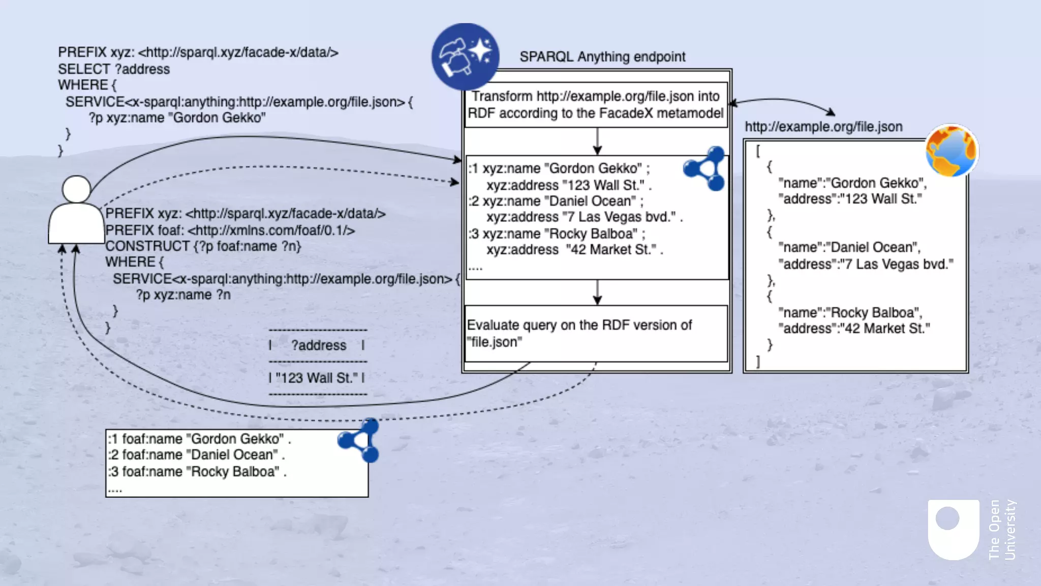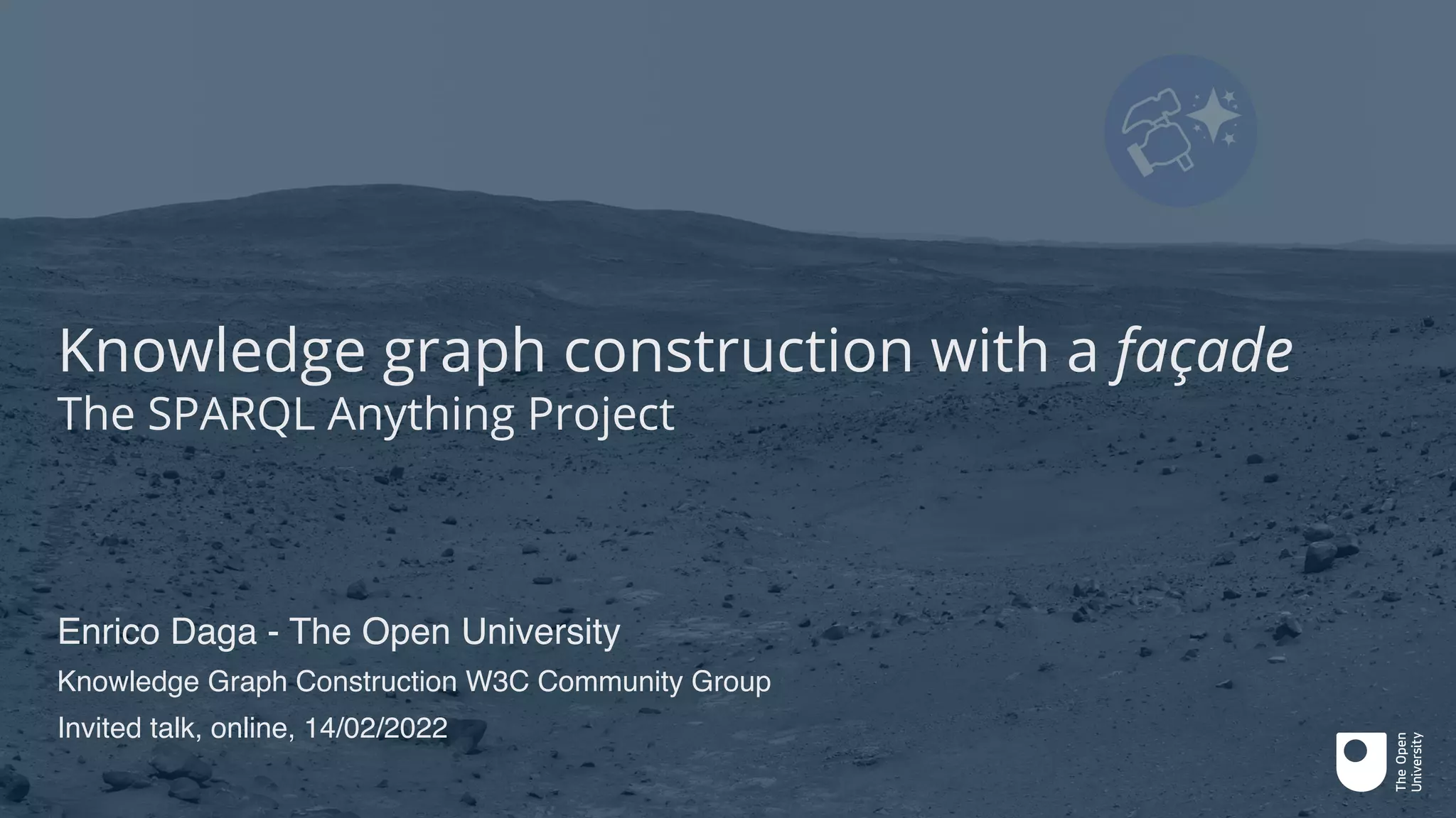 The document discusses a project called "SPARQL Anything" which aims to simplify knowledge graph construction by using SPARQL as the single language for representing and transforming diverse data formats into RDF. It presents an approach called "Facade-X" which defines a common RDF structure that can be applied over different formats like CSV, JSON, HTML, etc. This facade focuses on the RDF meta-model and aims to apply minimal ontological commitments. The document outlines how Facade-X can be used to represent different formats and provides examples of using SPARQL to transform sample data into RDF without committing to a specific domain ontology.
