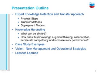 The document outlines an expert knowledge transfer strategy presented at APQC's 14th Knowledge Management Conference, detailing methods for retaining and transferring critical knowledge within organizations. It describes a structured process for identifying experts, assessing risks, determining knowledge transfer methods, and monitoring results, along with various approaches like mentoring, job shadowing, and knowledge harvesting. Additionally, the document emphasizes the importance of integrating product expertise and lessons learned to improve operational excellence and accelerate employee competency.