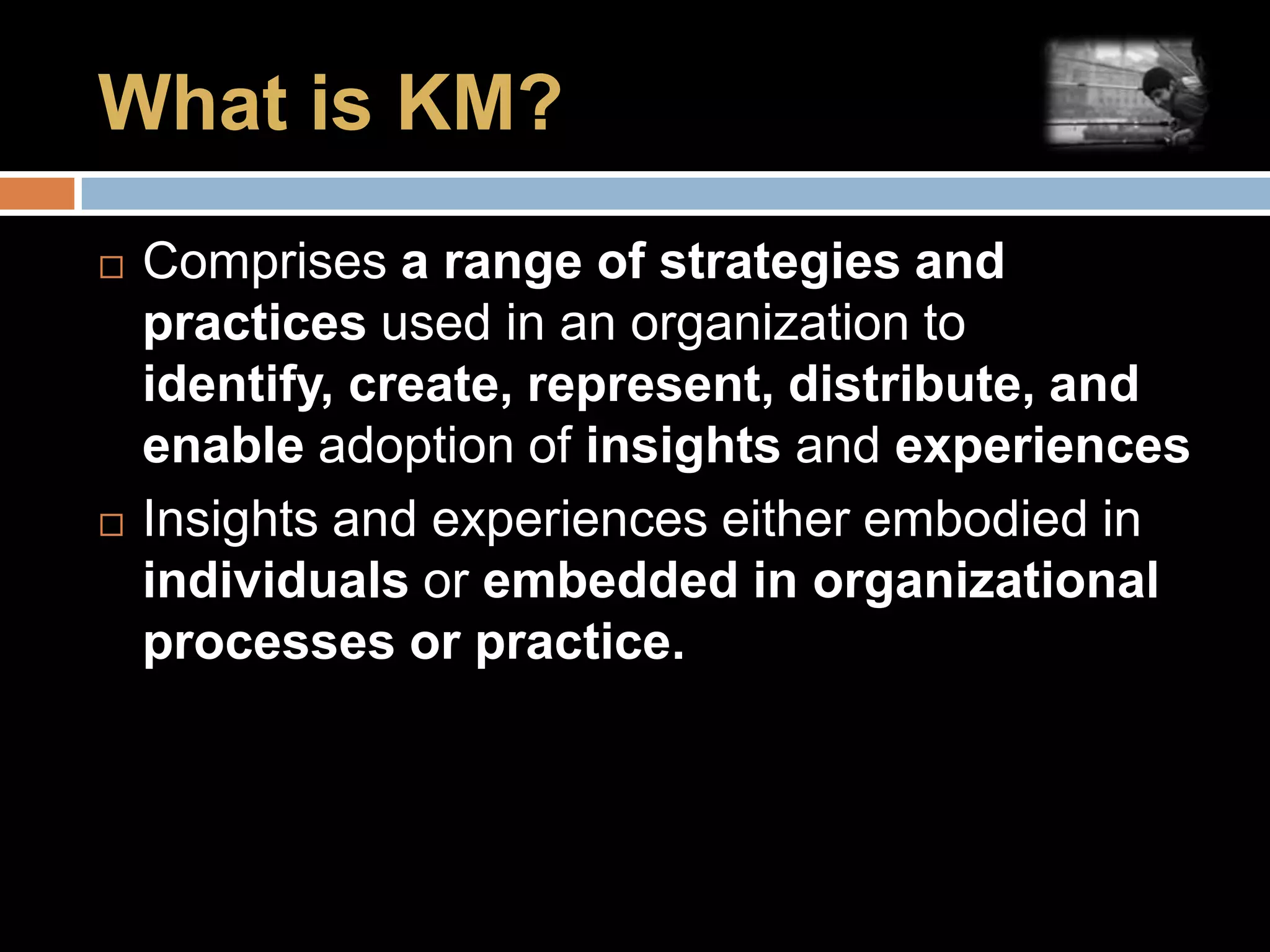 KM comprises strategies and practices used in an organization to identify, create, distribute, and adopt insights and experiences. Insights can be embodied in individuals or embedded in organizational processes. Many companies dedicate resources to KM as part of business strategy, IT, or HR. KM focuses on objectives like improved performance, competitive advantage, innovation, sharing lessons learned, and continuous improvement. KM efforts help individuals and groups share insights, reduce redundant work, avoid reinventing the wheel, reduce training time, retain intellectual capital, and adapt to changing environments. KM strategies include codifying explicit knowledge in repositories, making knowledge requests of experts on an ad hoc basis, and using rewards, storytelling, cross-project learning, and after