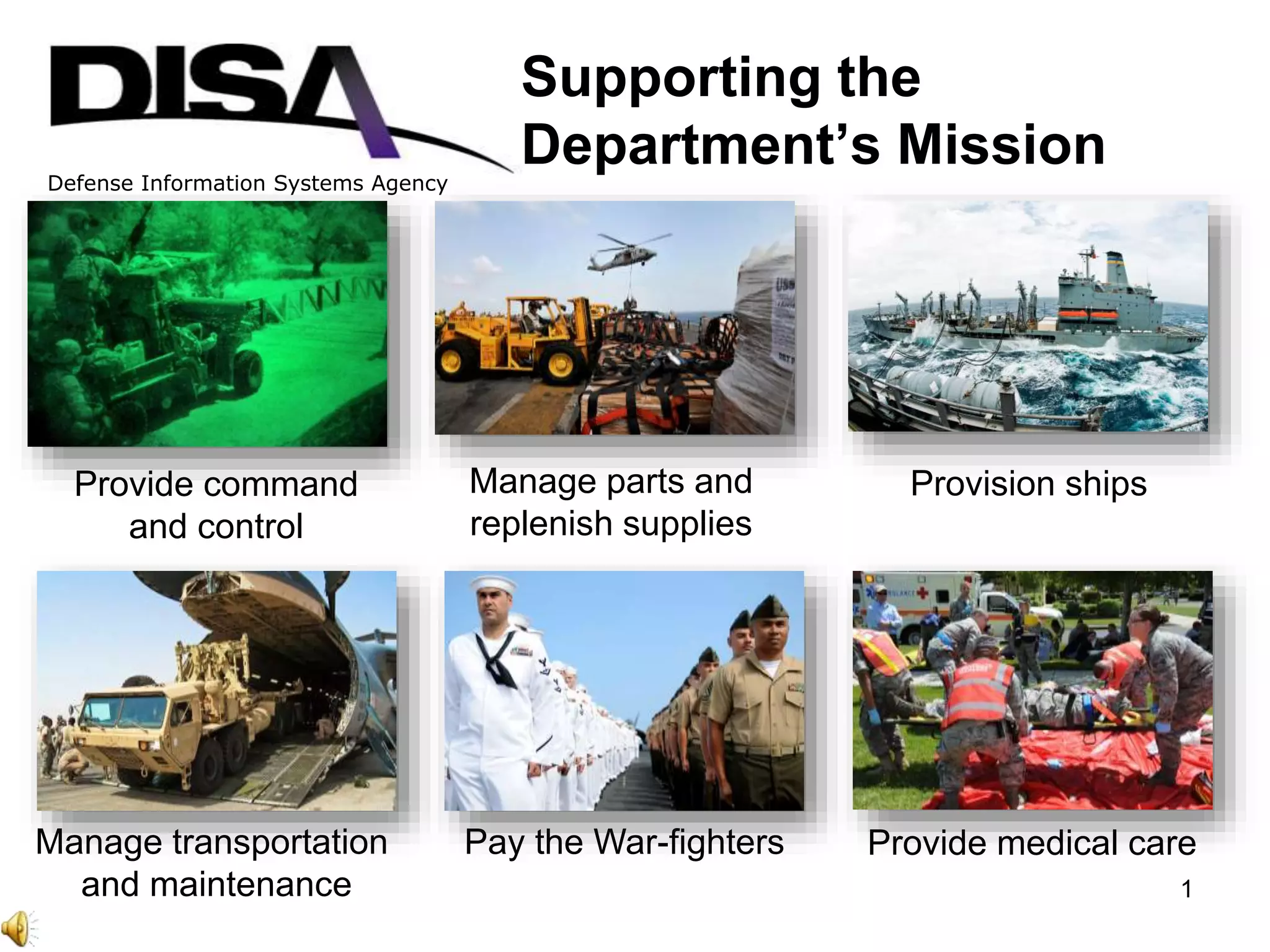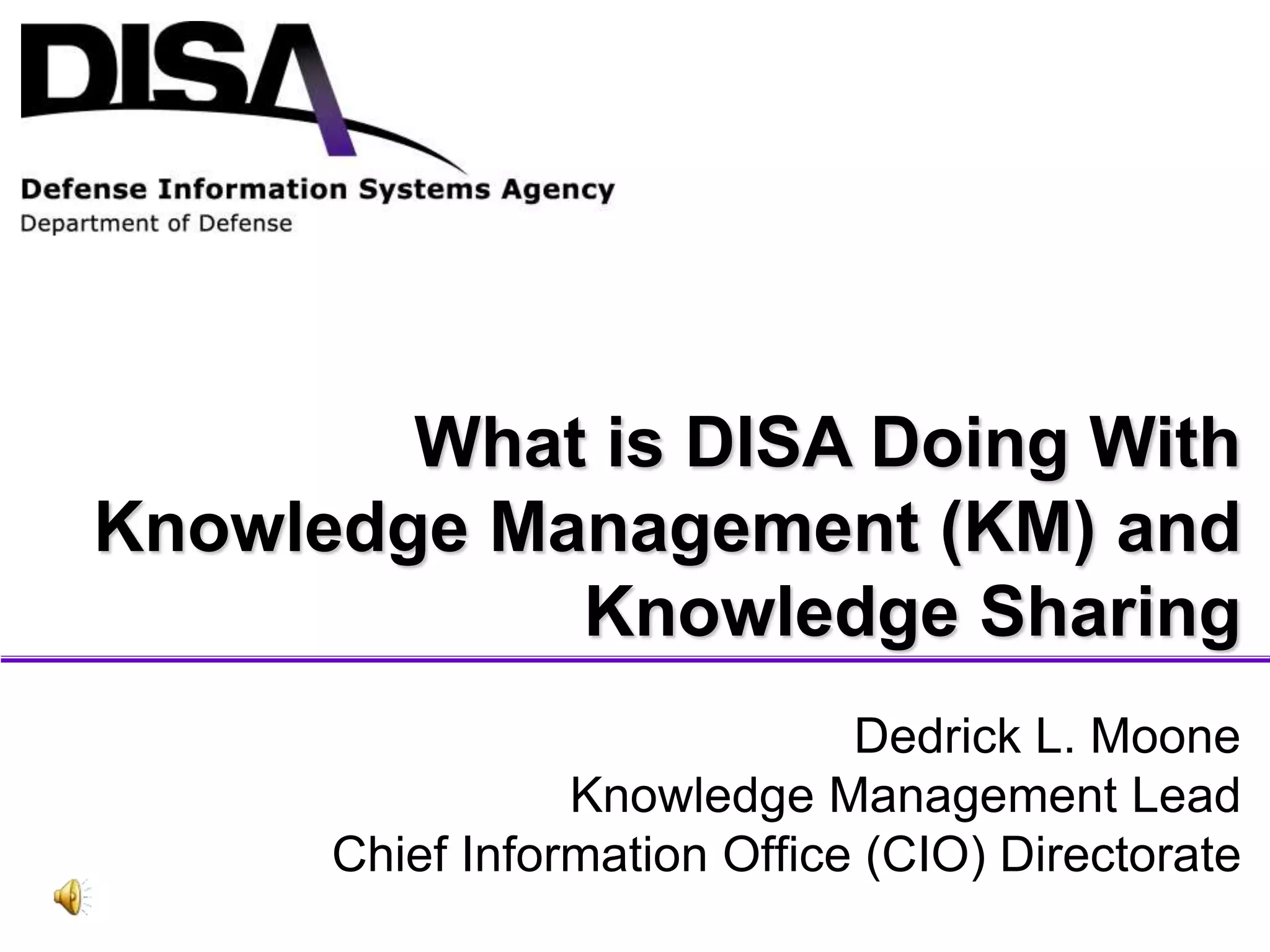 The Defense Information Systems Agency (DISA) is working to improve knowledge management and sharing. DISA aims to develop a transparent, collaborative environment to enable rapid information sharing across the agency. Some accomplishments include developing knowledge management support documents, holding a KM summit, establishing a KM council, and partnering with other organizations. DISA's strategic goals are to incorporate KM into business processes, improve access to expertise, foster intellectual capital growth, and enhance decision making.