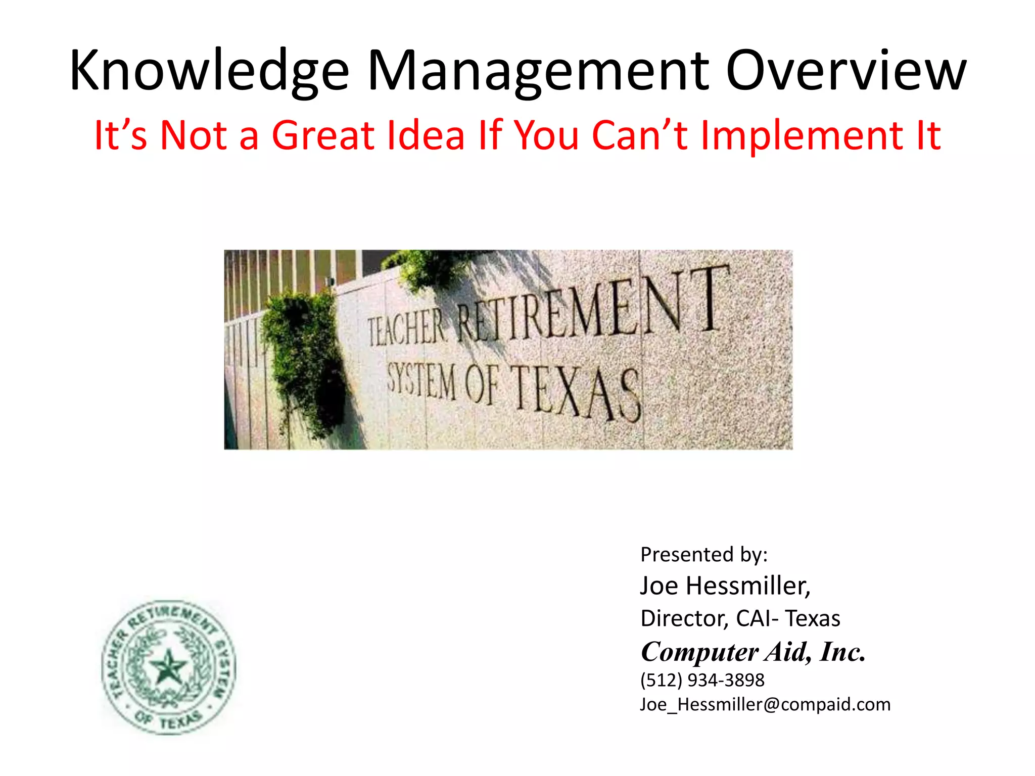 Joe Hessmiller presented on knowledge management. The presentation covered the basics of knowledge management including definitions, value, history and lessons learned. It discussed common mistakes made in KM projects and emphasized that KM is about people, not technology. The presentation also provided overviews of wiki software, leading KM products, and recommendations for implementing KM, including emphasizing human aspects over control and best practices.