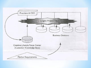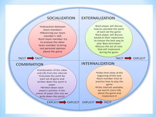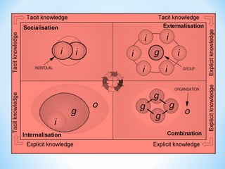 The document discusses the concept of "Ba", a shared space for knowledge creation proposed by Japanese philosophers. It provides three types of Ba - physical, virtual, and mental. Ba exists at different levels from individual to organization and beyond. Knowledge is also categorized into explicit and tacit forms. The SECI model is presented as a framework for knowledge conversion between tacit and explicit through socialization, externalization, combination, and internalization processes. Examples of companies applying Ba concepts such as dedicated teams and cross-functional groups at Toshiba and Maekawa are outlined.