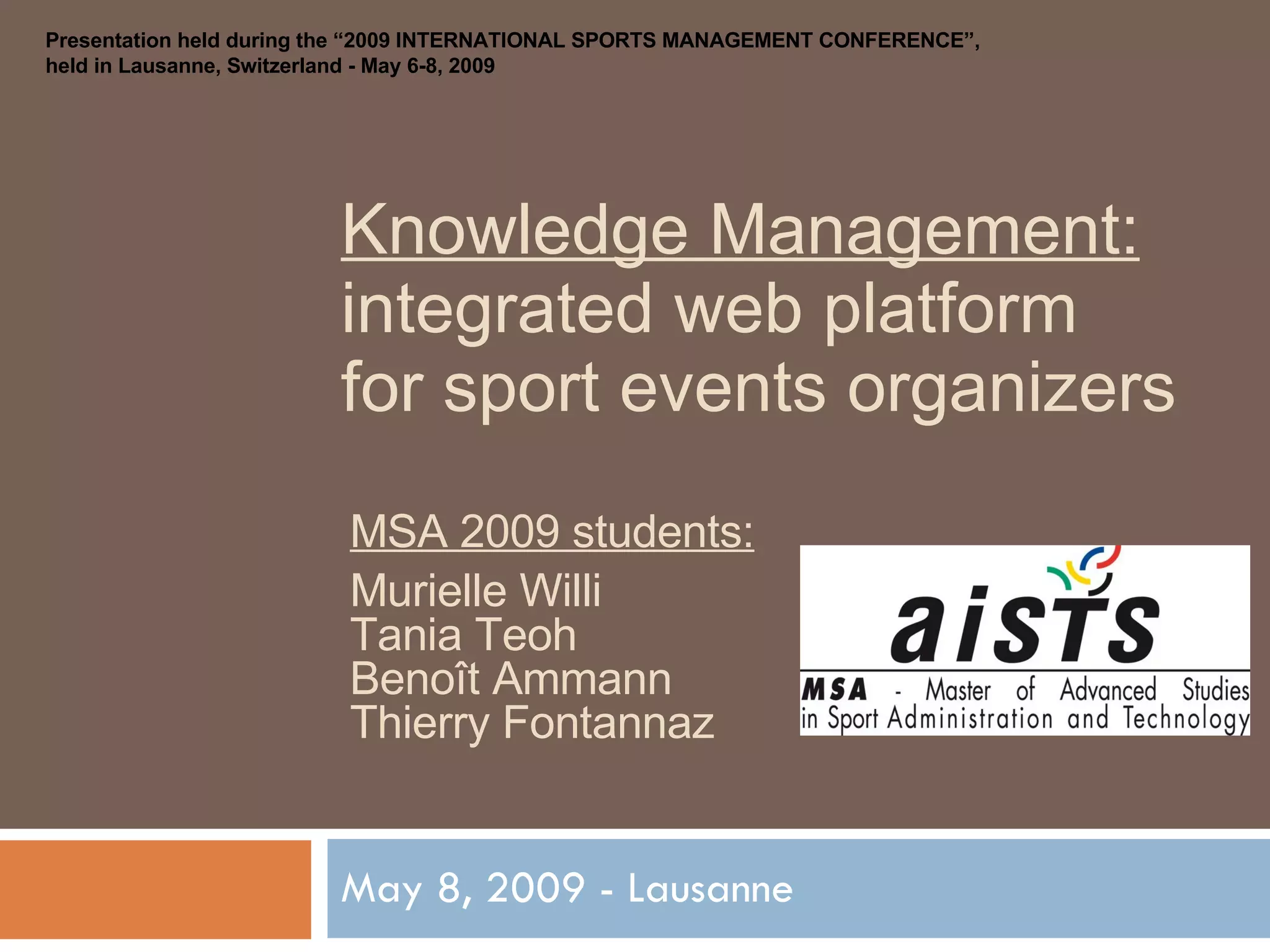 The document discusses the integration of an online platform for knowledge management tailored for sports event organizers, emphasizing the importance of effective knowledge sharing and collaboration among different sports organizations. It outlines key success factors, processes for capturing knowledge, and the potential benefits of using technology to streamline event management. Ultimately, the aim is to enhance the transfer of knowledge before, during, and after events to facilitate better planning and execution.