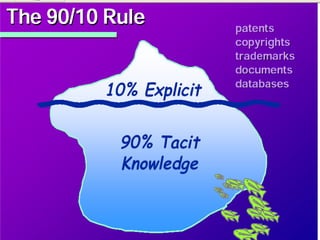The document outlines a strategy for developing a knowledge management (KM) system in libraries, emphasizing the importance of generating, codifying, and transferring knowledge effectively. It provides steps for implementation, including identifying problems, preparing for cultural changes, assembling a team, conducting knowledge audits, and managing knowledge assets. Additionally, it highlights common pitfalls to avoid and stresses that KM should be viewed as an ongoing management discipline rather than a one-time project.
