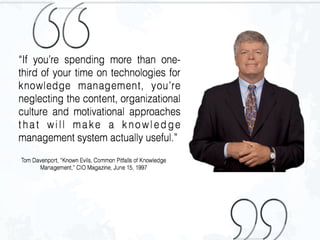 The document outlines the development of a knowledge management system aimed at improving data and knowledge management for informed policy-making in the maritime and fisheries sectors. It emphasizes the importance of identifying business problems, cultural changes in knowledge sharing, and executive support for successful implementation. Various use cases, including project collaboration and document management, are presented to illustrate the system's functionality and benefits.