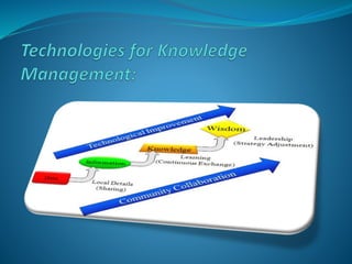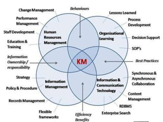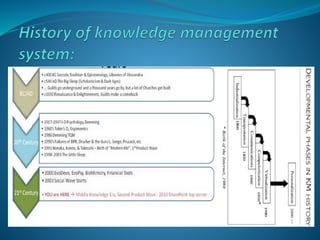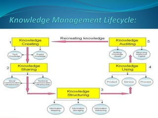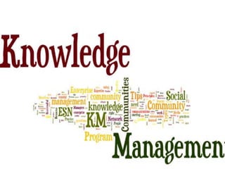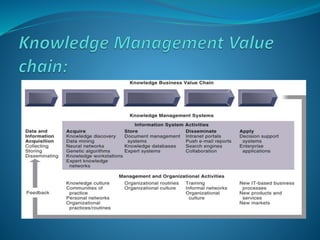 The presentation discusses the creation, distribution, and effective use of knowledge within organizations through various frameworks of knowledge management. It emphasizes the importance of both explicit and tacit knowledge and outlines methodologies for developing, sharing, and applying knowledge to enhance organizational effectiveness. Various scholars' contributions to knowledge processes are referenced, highlighting strategies for problem-solving, decision-making, and knowledge transfer.