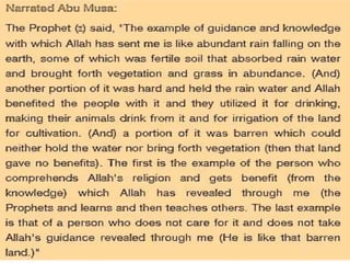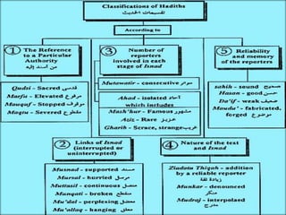 The document provides an extensive explanation of Quranic verses and emphasizes the importance of both the Quran and Hadith in understanding Islamic teachings. It outlines various classifications of Hadith, their narrators, and the methodology used to verify their authenticity. Additionally, it discusses the significance of the prophetic tradition and its role in guiding Muslim practices and beliefs.