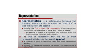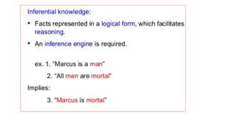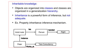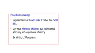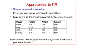 This document provides an introduction to knowledge representation in artificial intelligence. It discusses how knowledge representation and reasoning forms the basis of intelligent behavior through computational means. The key types of knowledge that need to be represented are defined, including objects, events, facts, and meta-knowledge. Different types of knowledge such as declarative, procedural, structural and heuristic knowledge are explained. The importance of knowledge representation for modeling intelligent behavior in agents is highlighted. The requirements for effective knowledge representation including representational adequacy, inferential adequacy, inferential efficiency, and acquisitional efficiency are outlined. Propositional logic is introduced as the simplest form of logic using propositions.