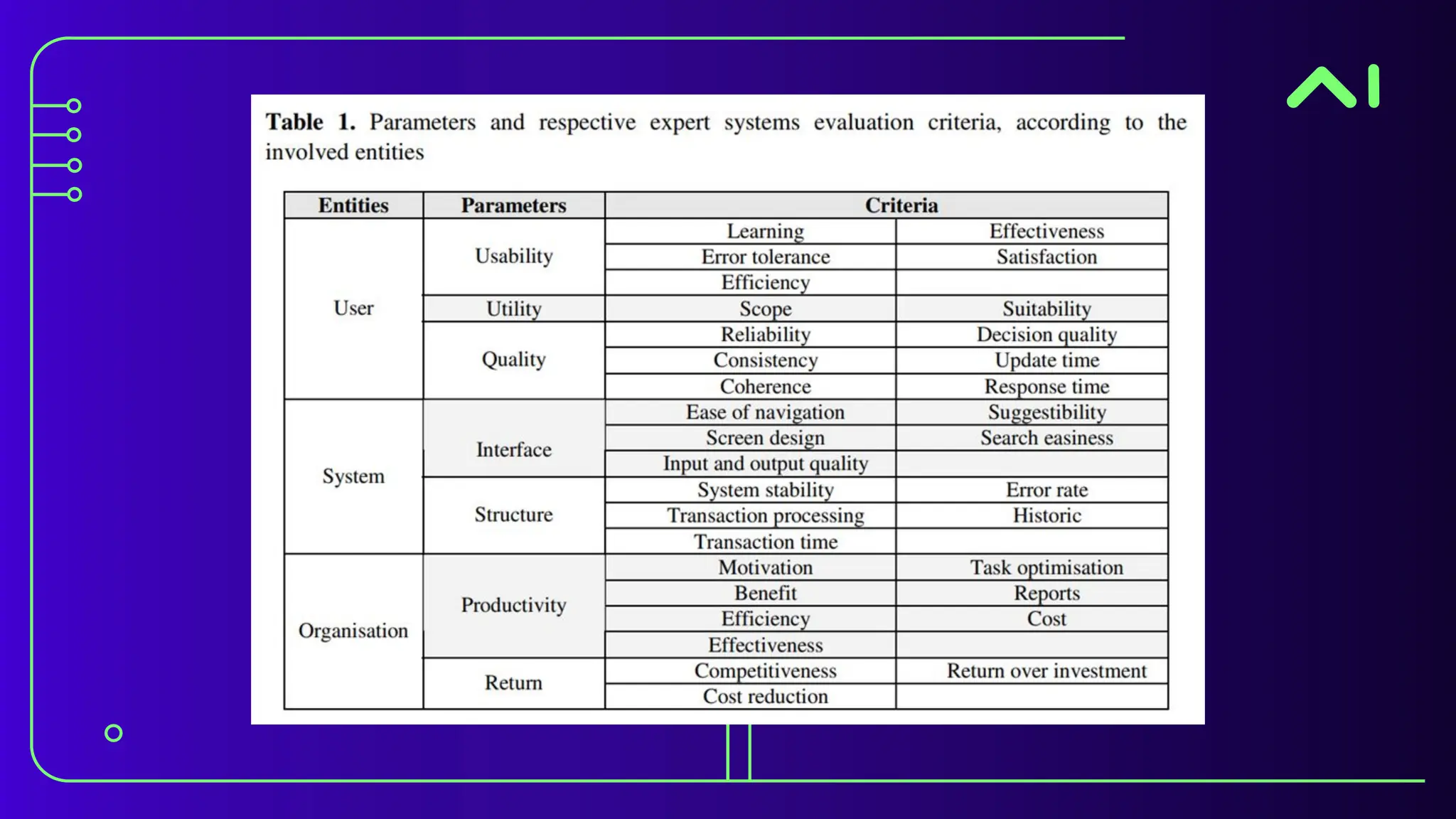 The document discusses expert systems, which are AI applications designed to solve complex problems through a knowledge base, inference engine, and user interface, enhancing decision-making in various fields like healthcare, finance, and customer support. It covers knowledge representation, detailing types such as logical representation, semantic networks, frames, production rules, ontologies, and neural networks, which help systems interpret and utilize real-world information. Finally, it addresses the evaluation of expert systems, emphasizing the need for assessing feasibility, functionality, performance, and user satisfaction throughout different stages of development and deployment.