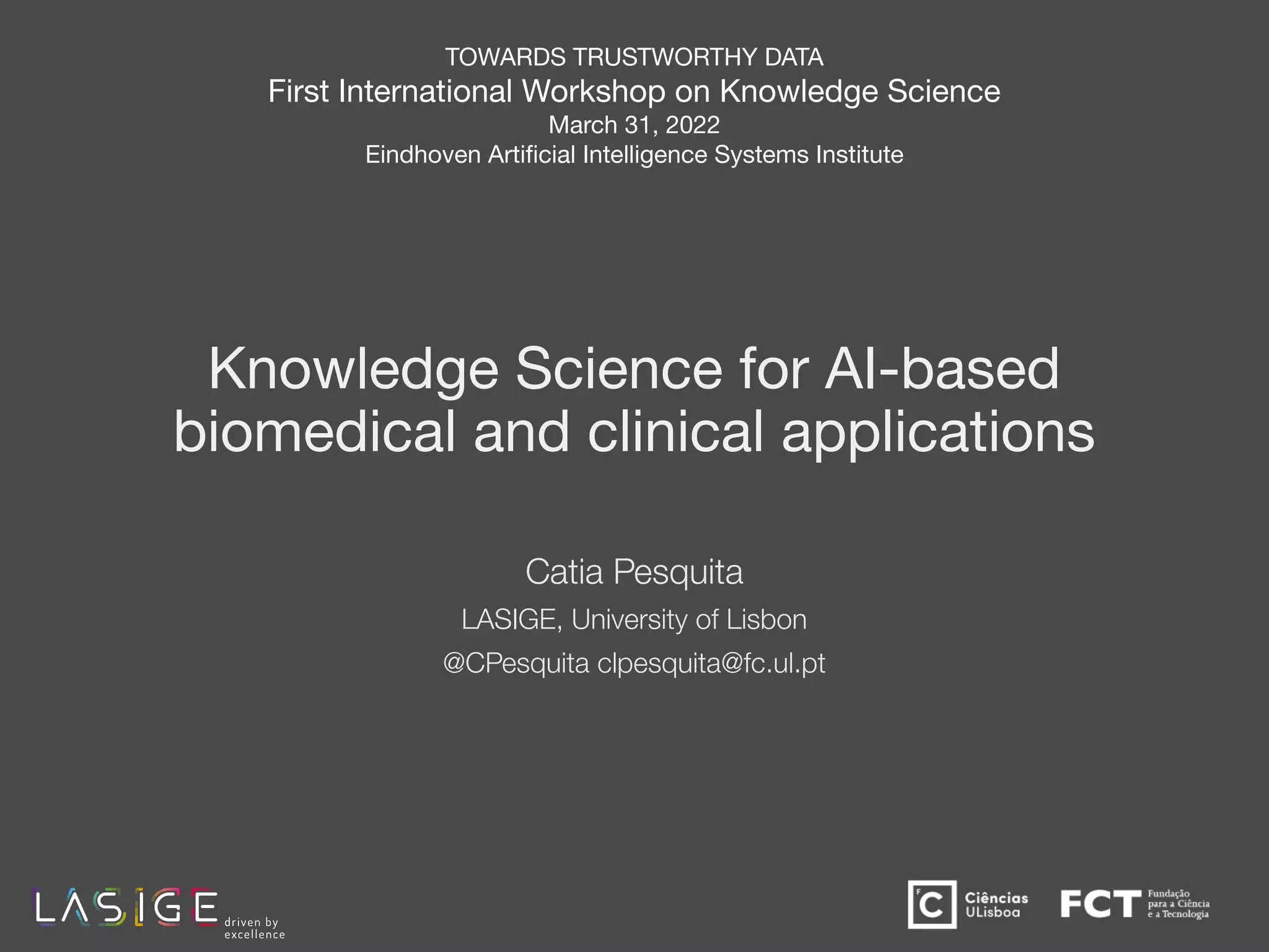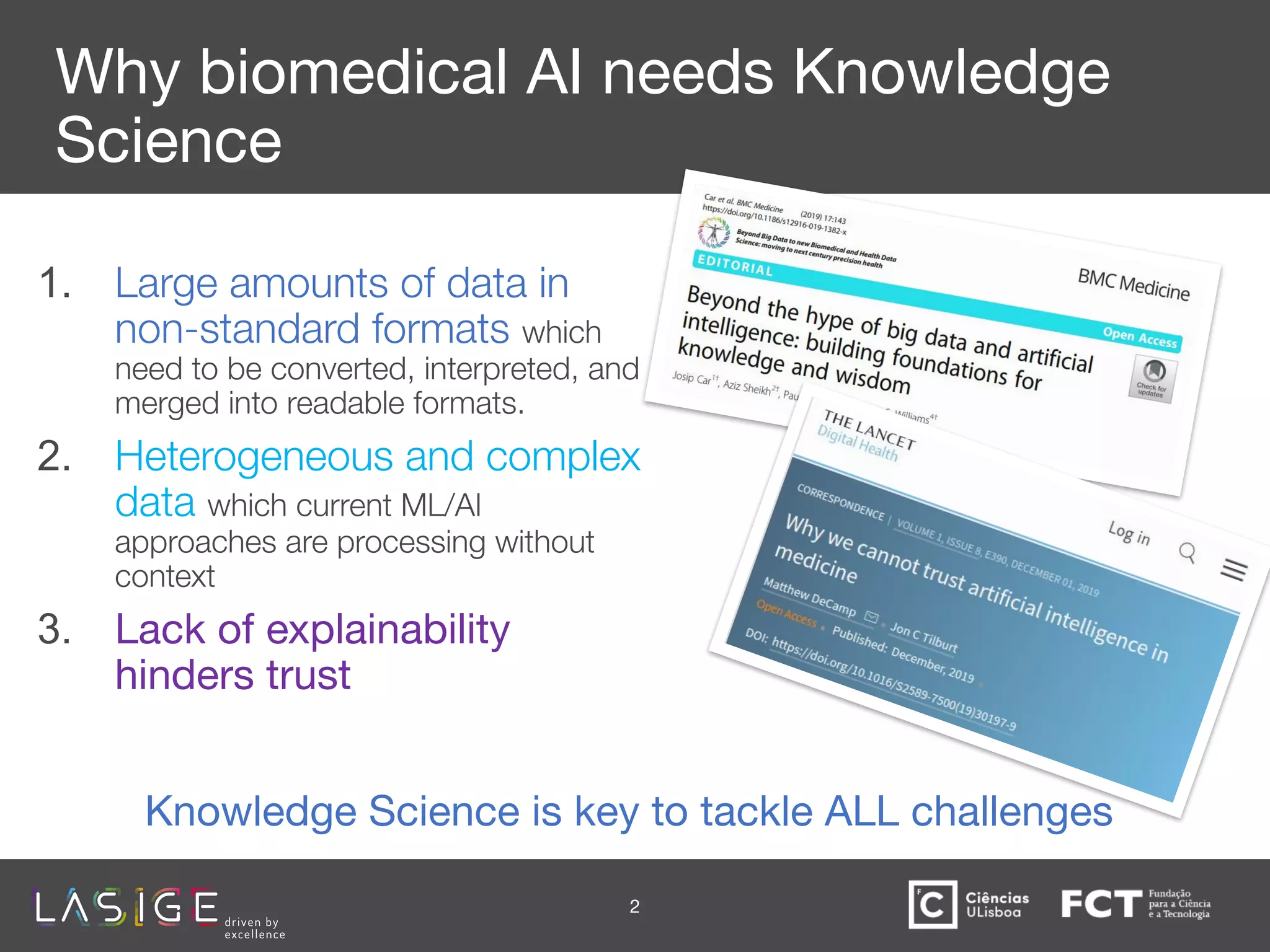 The document discusses the importance of knowledge science in enhancing trust in AI-based biomedical and clinical applications, particularly when dealing with complex and heterogeneous data. It emphasizes that trust can be achieved by representing model inputs, outputs, and processes and contextualizing them with domain and user knowledge. The integration of knowledge graphs and ontologies is suggested as a means to improve the explainability and reliability of AI systems in healthcare.