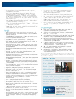 This document provides a summary of real estate and business news from the Greater Cincinnati area in February 2012. It includes over 50 brief updates on commercial real estate transactions, developments, leases, and other business activities across various sectors such as office, industrial, retail, and investment. Major developments include DHL's expansion adding over 180 jobs at CVG airport, DunnhumbyUSA building its new headquarters downtown, and Steiner & Associates planning a $300 million retail development in Liberty Township.