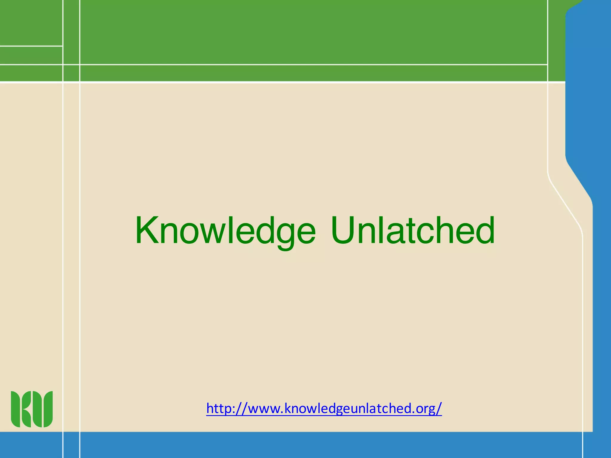 Knowledge Unlatched focuses on open access (OA) in humanities and social sciences, with over 100 monographs made OA and a community of around 300 libraries from 21 countries. The initiative aims to expand into backlist titles and journals, with plans to collect content from publishers starting June 2016 and a pilot program for journals targeting 350 libraries. Participation involves cost-sharing, with significant returns to publishers and targeted pricing for libraries.