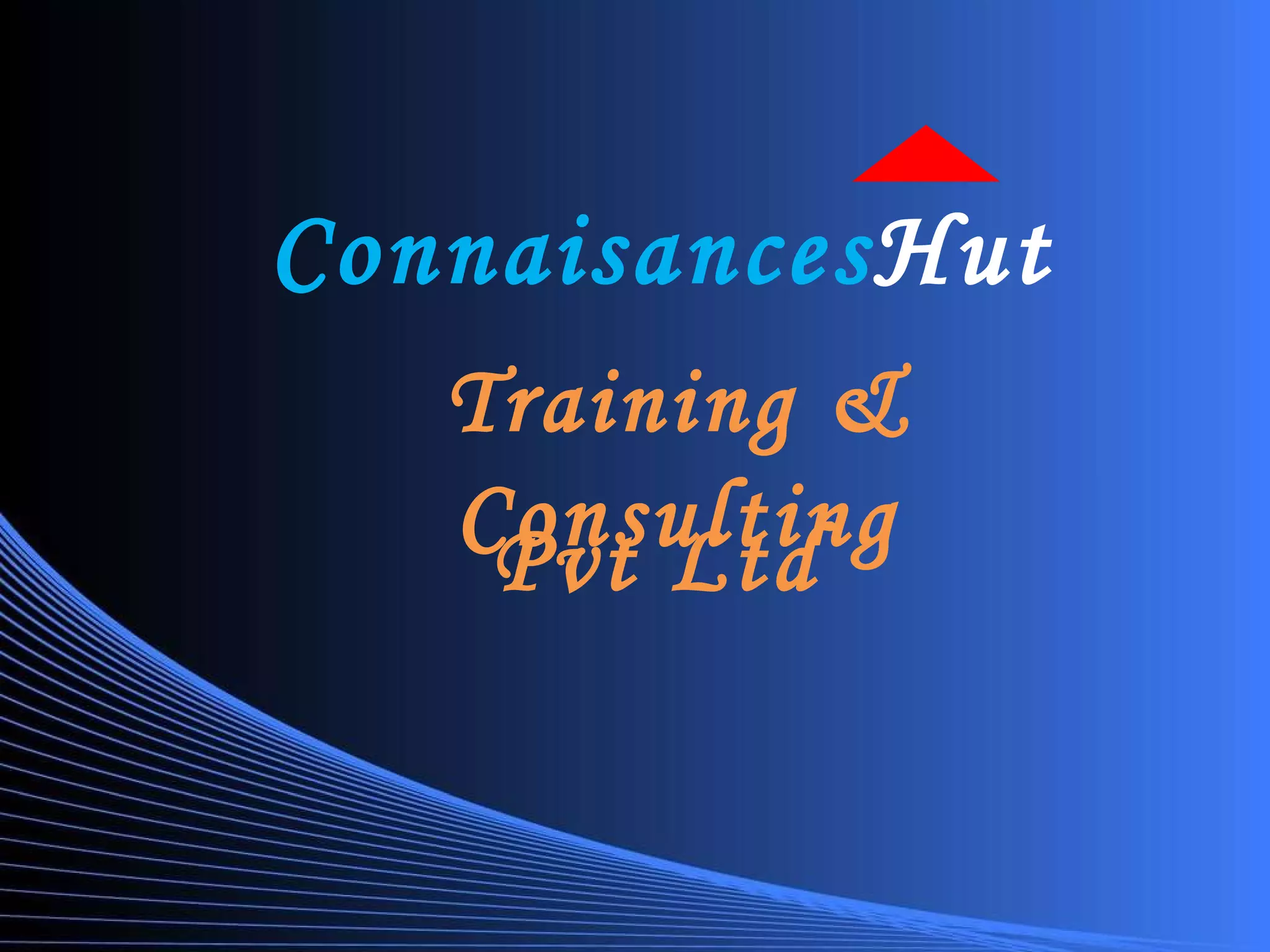Connaisances Hut Training & Consulting Pvt Ltd is a global training and consulting firm established in 2011 with over 50 employees across offices in the US and India. The company provides training, consulting, data solutions, and web development services to major corporate clients around the world. Its vision is to be a leading platform for organizational success by linking people, processes, and technology. The company aims to help clients improve profitability, resource optimization, governance, and compliance in a cost-effective manner.