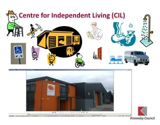 This document summarizes prevention and early intervention services in Knowsley, England that aim to help residents live longer, healthier lives in their own homes. It outlines services provided by the Centre for Independent Living (CIL) including adaptations, equipment, falls services, and occupational therapy. The CIL originally aimed to reduce waiting times, make services simple to access, and see people with complex needs using fewer professionals. It also discusses the Care & Repair service, which assisted over 5,000 residents last year with minor adaptations, repairs, and equipment loans. Finally, it provides an example of how extra care housing supported two brothers with disabilities to continue living together in the community.