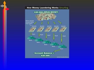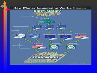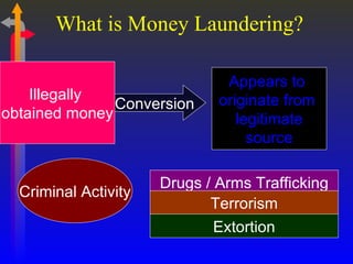 Money laundering involves disguising illegally obtained money to make it appear legitimate. Key aspects of preventing money laundering include complying with know-your-customer (KYC) norms, identifying suspicious transactions, and reporting cash and suspicious transactions to authorities on time. Banks must implement anti-money laundering measures like monitoring high-risk accounts, appointing compliance officers, and training staff to detect and deter money laundering activities.