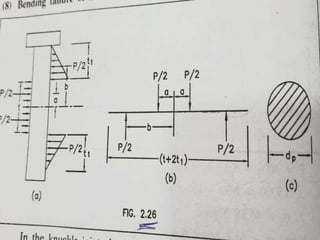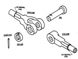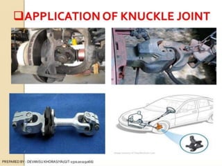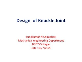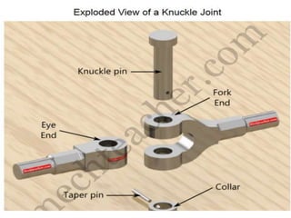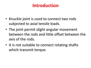 The document summarizes the design of a knuckle joint used to connect two rods subjected to axial tensile loads. It describes the main parts of a knuckle joint including the single eye end, double eye end, knuckle pin, and collar. It then provides the design procedure which involves checking for tensile, shear, crushing, and bending failures. As an example, it provides the design of a knuckle joint to connect two 16mm rods subjected to a tensile load of 12kN, calculating dimensions to ensure it is safe against various failure modes.