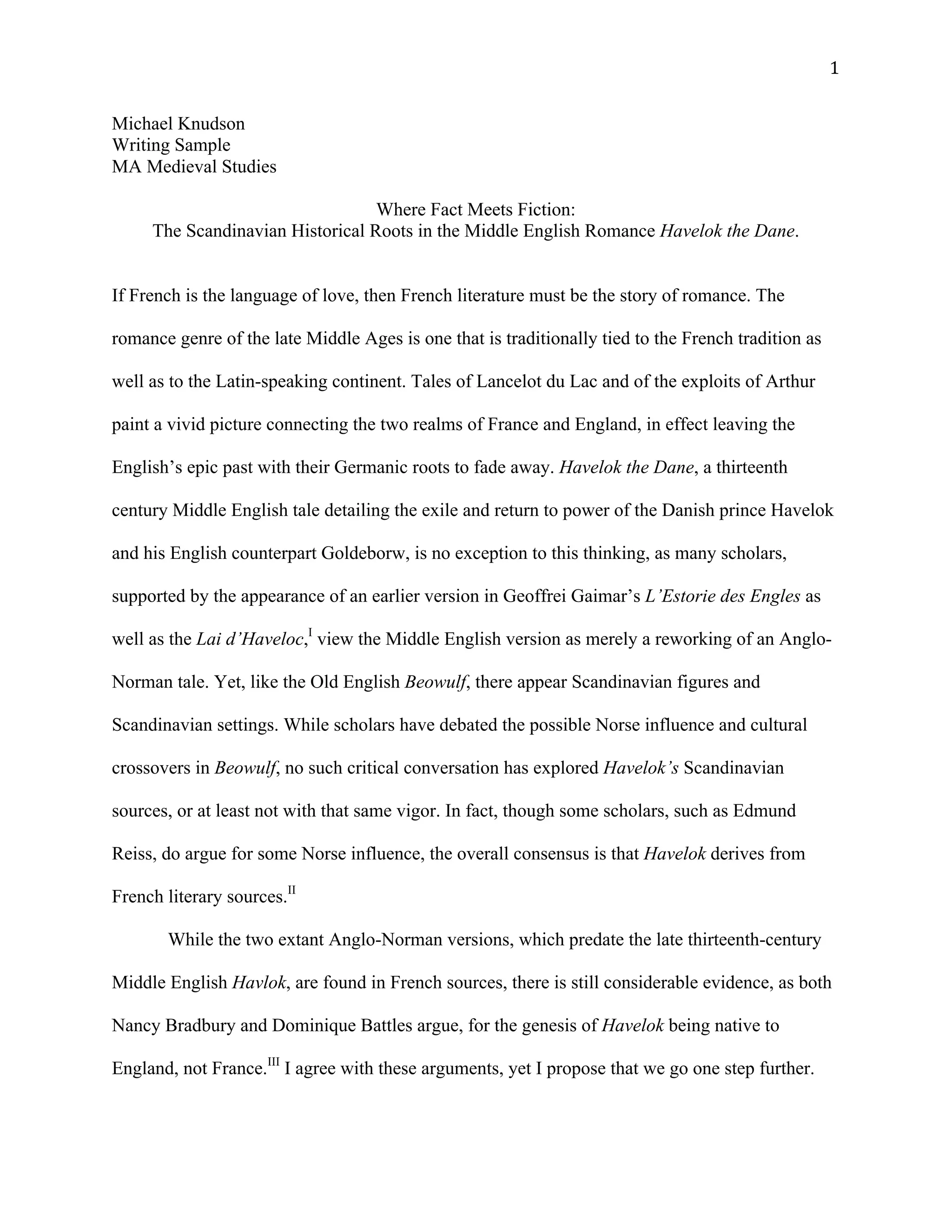 The document discusses the Scandinavian historical roots in the Middle English romance Havelok the Dane. It argues that while traditionally viewed as derived from French sources, Havelok draws from Scandinavian history as well. The author proposes that characters such as Havelok and his father Birkabeyn were modeled after figures from 12th century Norwegian history, specifically the Birkebeiner faction involved in civil wars. The document provides historical context on Norse settlement and influence in England, particularly the Danelaw region where Havelok was composed, to support the claim of Scandinavian influence on the work.